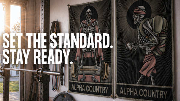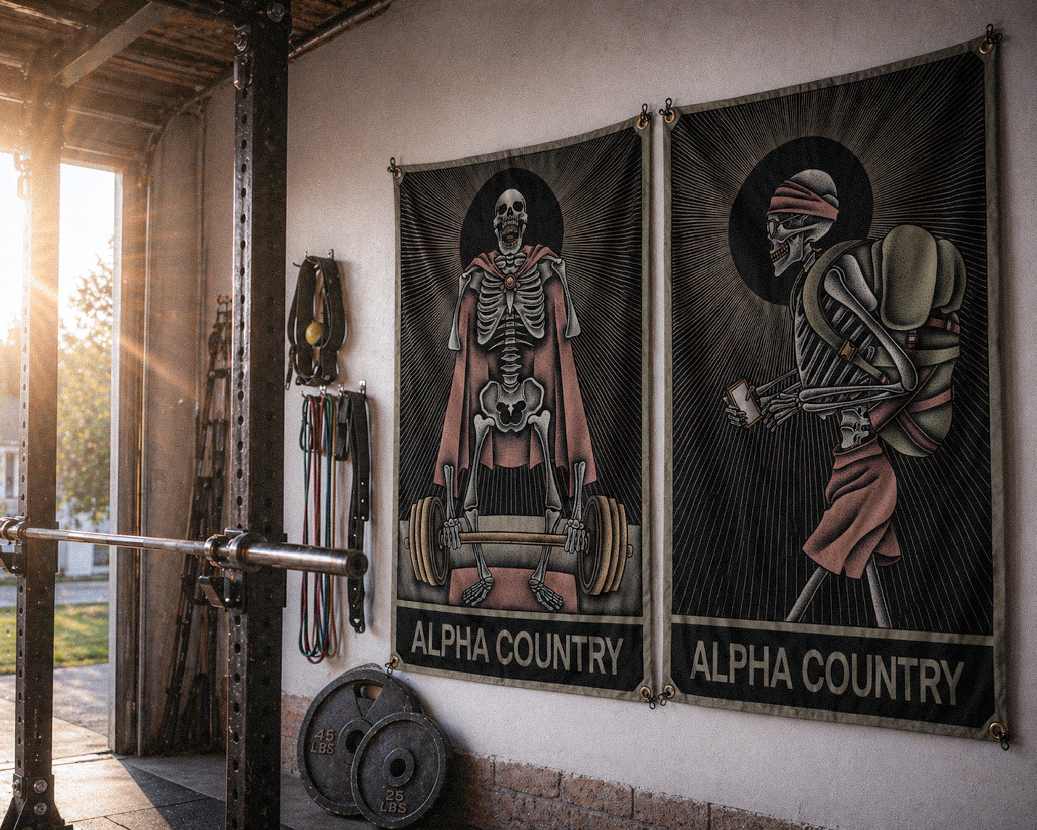 Original artwork. Two designs. Last March and DEADlift — hand-drawn pieces built around the patron saints of grit: the rucker who keeps moving and the lifter who refuses to put it down.